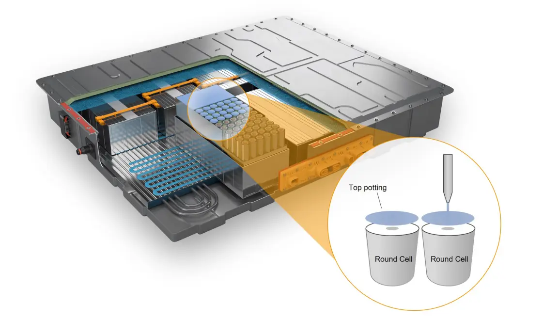 This property set renders ELASTOSIL® CM 181 the ideal candidate for filling the gaps between cells in the battery pack or module. Potting serves to isolate the cells electrically and thermally while also providing mechanical support and a protective function. As a result, vibrations, shocks, and thermal expansion of the cells can be absorbed and counterbalanced, without the cell assembly being placed under mechanical stress. In addition, the thermally insulating silicone elastomer hinders further heat transfer via the side-walls of the cells. Potting the spaces between the cells with ELASTOSIL® CM 181 thus ensures more reliable battery-cell operation.